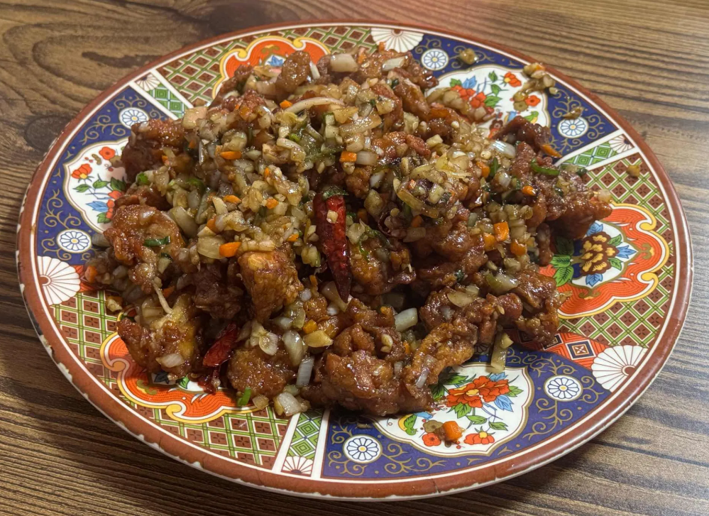 바삭하게 튀긴 닭에 감칠맛 나는 소스와 다진 채소가 어우러지는 스타일로,